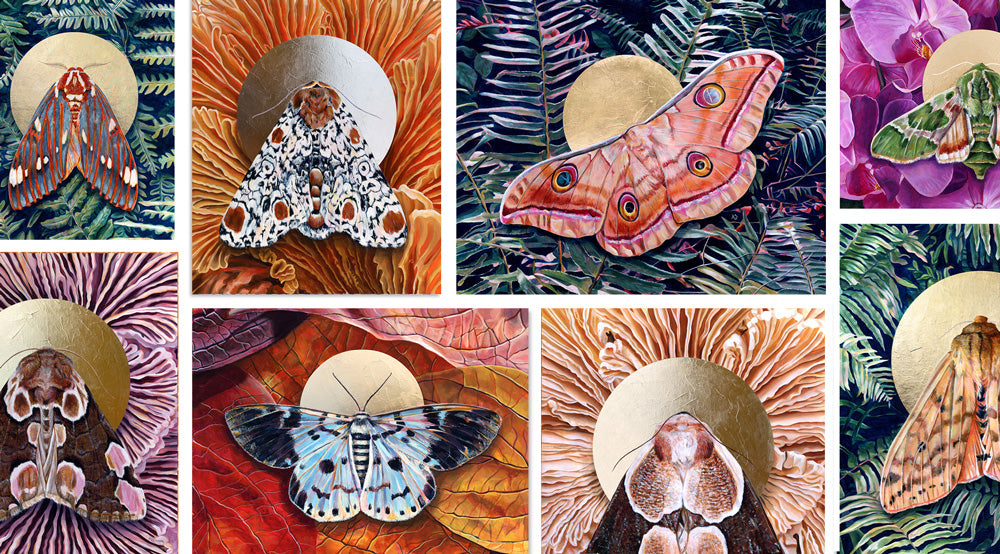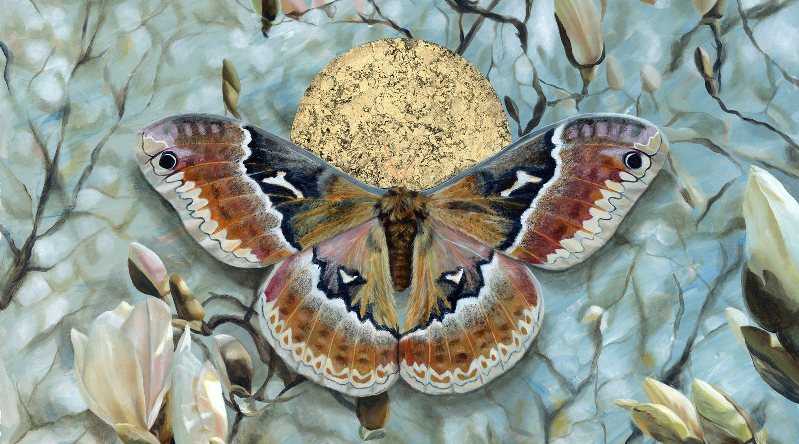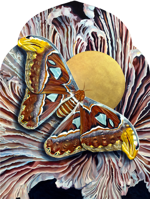 Moths in particular have always fascinated me with their otherworldly colors, intricate forms, and evocative symbolism. I’m interested in exploring themes of transformation and impermanence through my paintings, always striving to discover the connective threads that bind us to reality, fantasy, and each other. Experimenting with different surfaces and techniques to make room for the unexpected, I frequently use metal leaf and translucent layers of jewel-toned open acrylic paints to create symbolic representational artwork that leans toward the surreal.